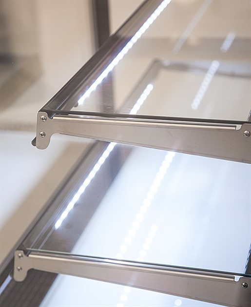 Två justerbara hyllplan med LED belysning på varje hyllplan.